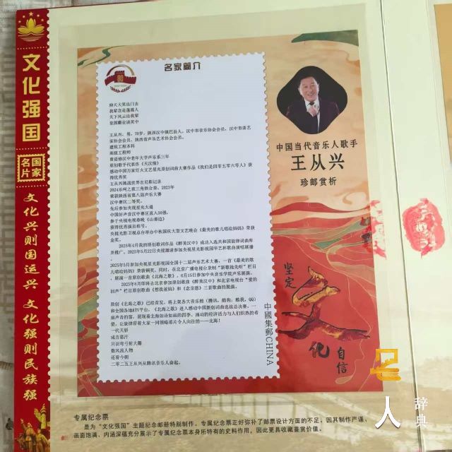 中国文化部门联合中国邮政部门,命名为中国文化典范人物。中国当代音乐人歌手。王从兴剧照制作邮票画册即将发行面市,将与全世界人民见面。2025年6月由王从兴翻唱《草原上升起不落的太阳》和《我把草原的祝福送给你》
