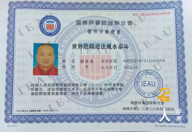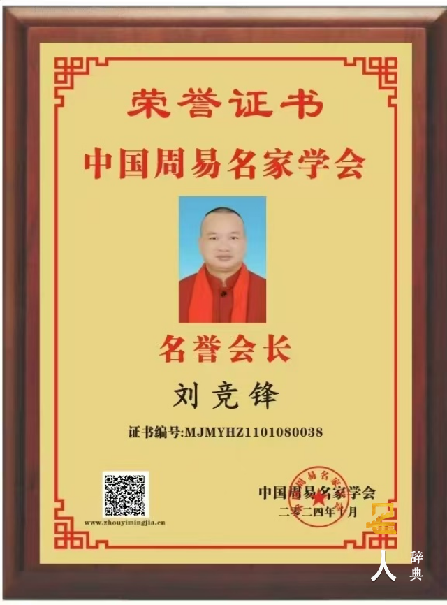 刘竞锋大师游历世界各国,足迹踏遍名山大川,访寻名师益友,苦心研究易学、风水学、阴阳学、星相学、命理学、姓名学、择日学、三魂七魄养生旺命学、人类基因密码学和风水能量学,2016年9月6日成功通过国际风水能力水平IEAU的标准考试认证,被国际评审认证联合会授予高级“世界风水大师”国际荣誉称号!证书编号:IEAU16CNI505029,2021年12月10日成功通过“世界阴阳道法风水大师”“世界风水布局大师”资格认证,是世界上第一位获得国际评审认证联合会认证为“世界阴阳道法风水大师”“世界风水布局大师”的易学泰斗级大师,“世界阴阳道法风水大师”证书编号:IEAU21CNI52701N,“世界风水布局大师”证书编号:IEAU21CNI52601N,2022年7月7日,刘竞锋大师荣耀通过国际评审认证联合会认证,授予“世界堪舆风水布局泰斗”荣誉称号,证书编号:IEAU22CNI52801Q,核发中英文双证,成为当今世界上第一位也是唯一一位经国际认证的“世界堪舆风水布局泰斗”的泰斗级大师,并在国际评审认证联合会官方网站永久性存档和宣传,并报由国家人力资源和社会保障部人才库备案。