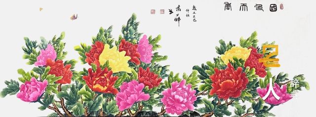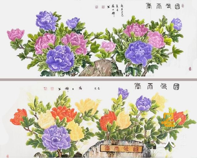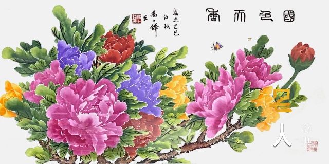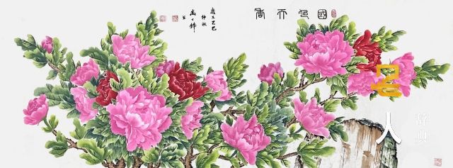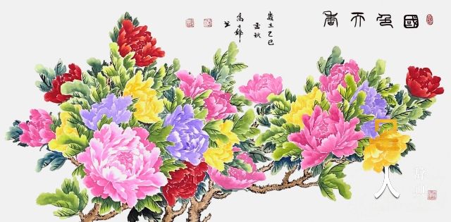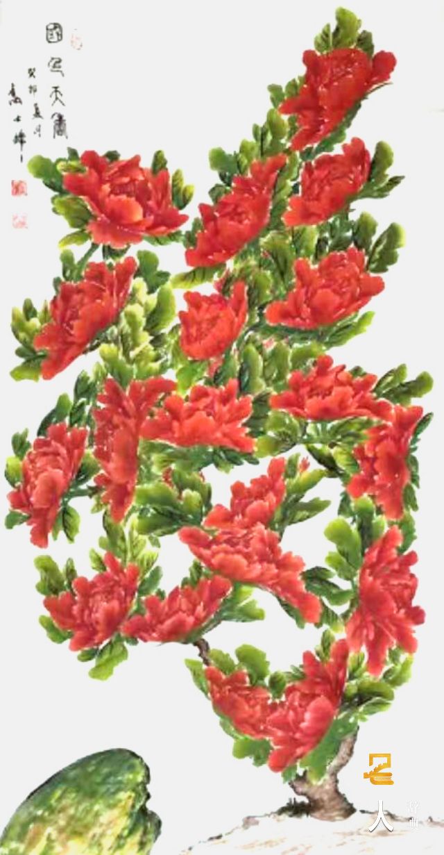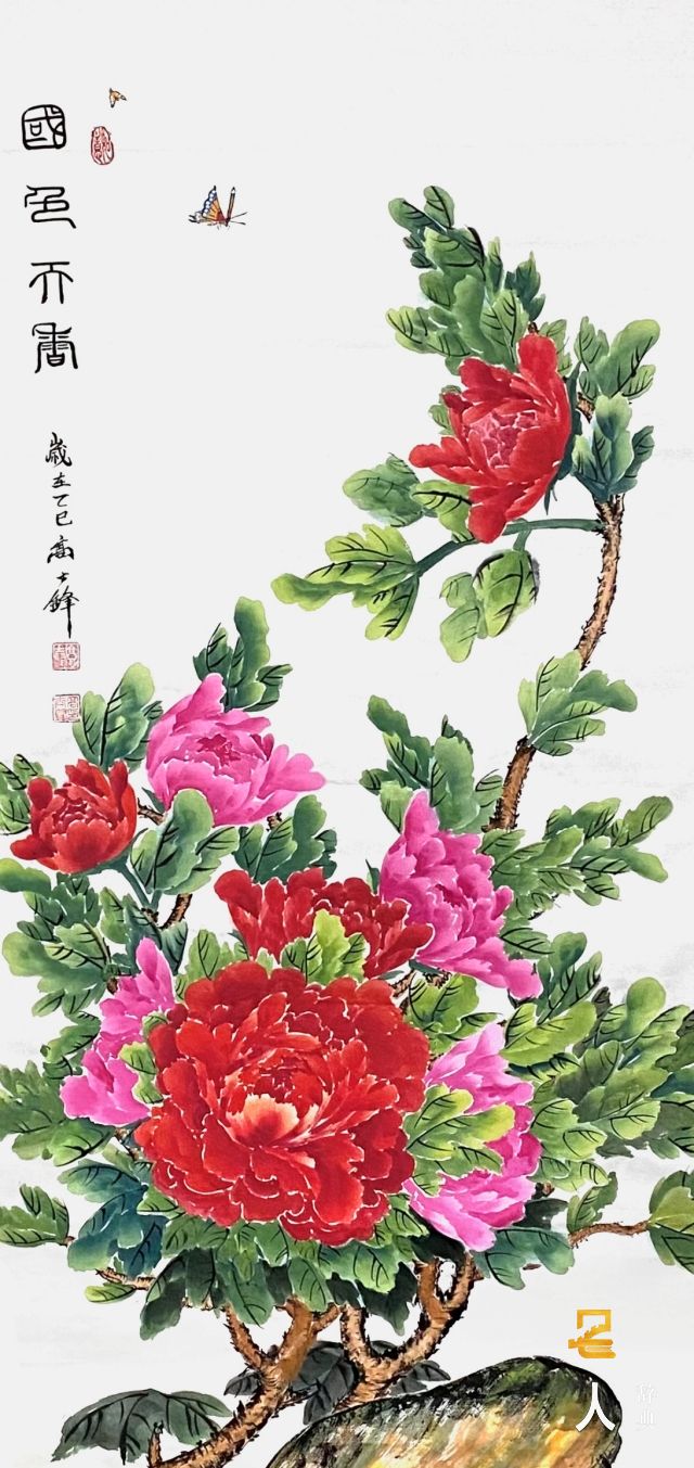 高士锋的艺术作品特点鲜明,尤以牡丹花的表现最为出色。其笔下的牡丹展现了“国色天香”的美学精髓,既传承了中国传统绘画技法,又融入了现代审美理念。特别是在牡丹的怒放和半开状态的表现上,高士锋通过大胆的色彩运用与精湛的笔法,使得每一朵花都显得生动活泼,充满生命力,给人一种生机勃勃的感觉。