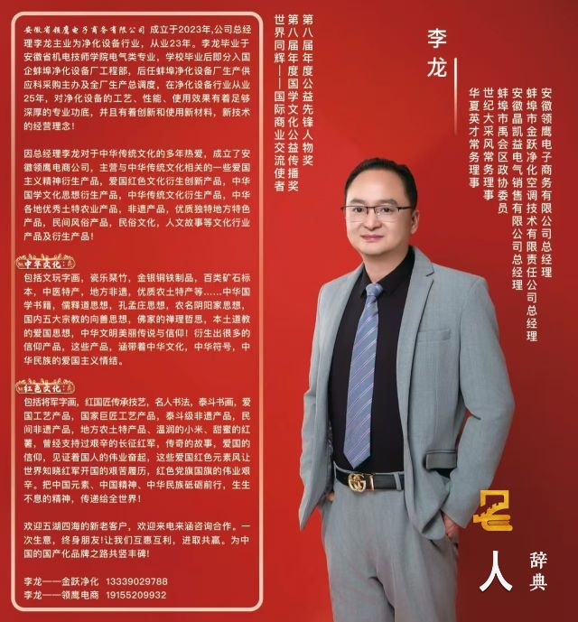 因总经理李龙对于中华传统文化的多年热爱,成立了安徽领鹰电商公司。主营与中华传统文化相关的一些爱国主义精神衍生产品,爱国红色文化衍生创新产品,中华国学文化思想衍生产品,中华传统文化衍生产品,中华各地优秀土特农业产品,非遗产品,优质独特地方特色产品,民间风俗产品,民俗文化,人文故事,中华国粹等文化行业产品及衍生产品!
