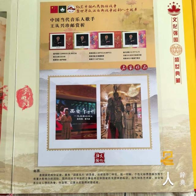 中国文化部门联合中国邮政部门,命名为中国文化典范人物。中国当代音乐人歌手。王从兴剧照制作邮票画册即将发行面市,将与全世界人民见面。2025年6月由王从兴翻唱《草原上升起不落的太阳》和《我把草原的祝福送给你》