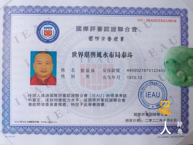 刘竞锋大师游历世界各国,足迹踏遍名山大川,访寻名师益友,苦心研究易学、风水学、阴阳学、星相学、命理学、姓名学、择日学、三魂七魄养生旺命学、人类基因密码学和风水能量学,2016年9月6日成功通过国际风水能力水平IEAU的标准考试认证,被国际评审认证联合会授予高级“世界风水大师”国际荣誉称号!证书编号:IEAU16CNI505029,2021年12月10日成功通过“世界阴阳道法风水大师”“世界风水布局大师”资格认证,是世界上第一位获得国际评审认证联合会认证为“世界阴阳道法风水大师”“世界风水布局大师”的易学泰斗级大师,“世界阴阳道法风水大师”证书编号:IEAU21CNI52701N,“世界风水布局大师”证书编号:IEAU21CNI52601N,2022年7月7日,刘竞锋大师荣耀通过国际评审认证联合会认证,授予“世界堪舆风水布局泰斗”荣誉称号,证书编号:IEAU22CNI52801Q,核发中英文双证,成为当今世界上第一位也是唯一一位经国际认证的“世界堪舆风水布局泰斗”的泰斗级大师,并在国际评审认证联合会官方网站永久性存档和宣传,并报由国家人力资源和社会保障部人才库备案。