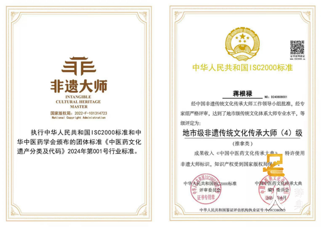 今年 4 月份,为传承和发展中华传统文化实施乡村文化振兴国家战略,发扬光大中医药、民族医药传统文化,促进中医药、民族医药事业的发展,借鉴文化传承人的智慧,汲取先进理念,针对中医药传承文化市场缺失规范性、实用性等情况下,由中华人民共和国 ISC2000标准评审委员会 2024 年 4 月 16 日 ISC 标评〔2024〕1 号文件批准,成立了《中国中医药文化传承大典》编审委员会,汇编中医药非遗传统文化传承优秀人才,助力乡村文化振兴。为弘扬中医文化传播尽自己绵薄之力,蒋根禄老师还积极申报了非物质文化遗产传承大师,并被编审委员会评定为非遗大师。