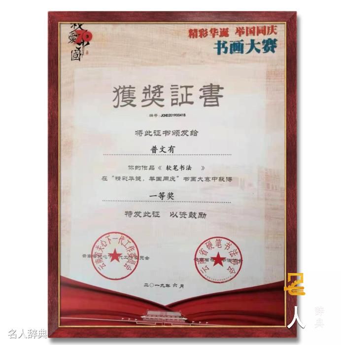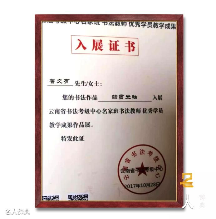普文有,现为中国硬笔书法协会会员,中国书法家协会书法考级注册教师,云南省硬笔书法协会理事,云南省书法家协会会员,昆明市书法家协会会员。