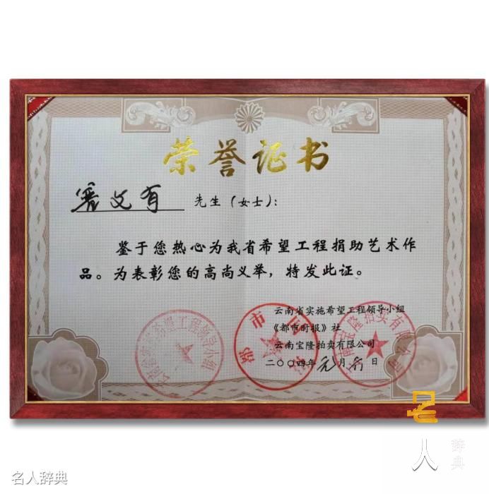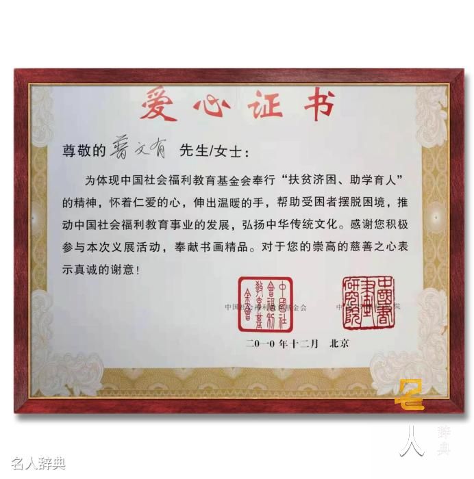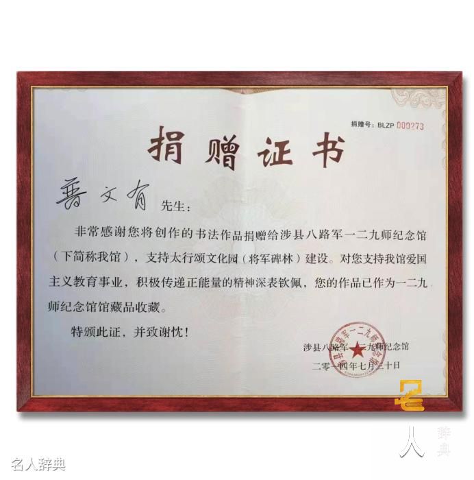 等捐赠书法作品数十件,书法作品被吉林省博物馆等相关单位永久收藏。